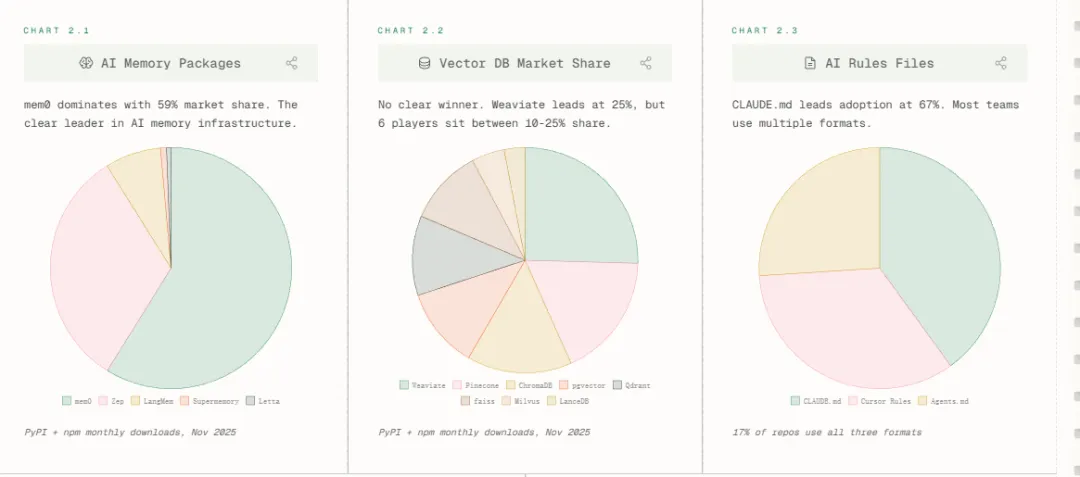 效率跃升的背后,是支撑性技术栈的激烈重构。报告以不同大模型提供商的SDK下载量为考察变量,发现在AI记忆模块中,mem0以59%市占率一骑绝尘;而对比向量数据库「六强混战」(Weaviate 25%领先,Chroma/Pinecone/Qdrant等紧咬)。