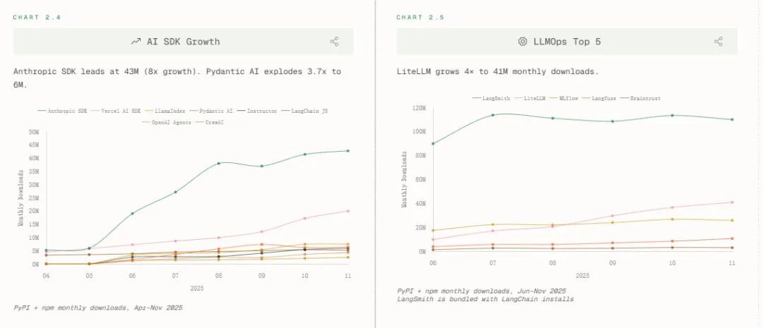 LLMOps层,LiteLLM增长4倍至4100万下载,LangSmith借LangChain生态捆绑上位。这印证一个趋势,即模型调度、监控、降级已从「可选项」变为「基建标配」。