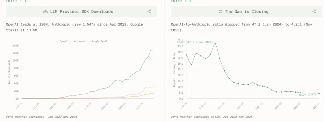 对于模型间的军备竞赛,该报告考察模型提供商从2022年1月到2025年11月的SDK下载量,主要玩家是OpenAI、Anthropic和Google GenAI。OpenAI以一条陡峭上升的绿色曲线主导市场。其下载量从2022年初的几乎为零,一路飙升至2025年11月的1.3亿次,确立了绝对的市场领导者地位。