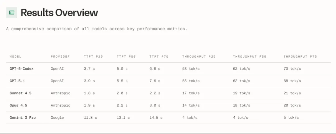通过该表,可看出Claude Sonnet 4.5与Opus 4.5只需要等待不到2.5秒,就会返回第一个token,显著优于GPT-5系(>5秒)。而在交互式编程中,2秒是「心流」与「分心」的临界阈值。