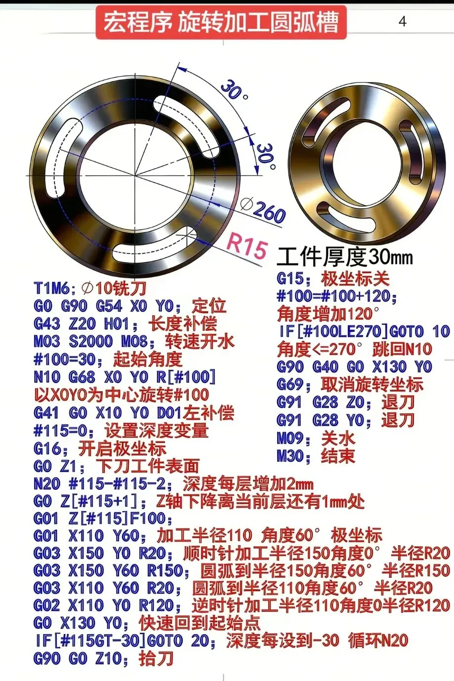 图中是环形工件,外圆φ260,厚度30mm,均匀分布3个30°角的圆弧槽。若手动编程,需重复编写3组几乎相同的代码,不仅耗时,还容易漏改参数……