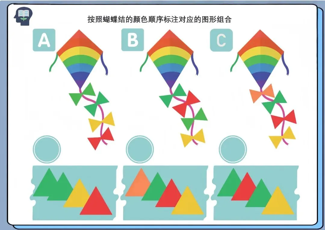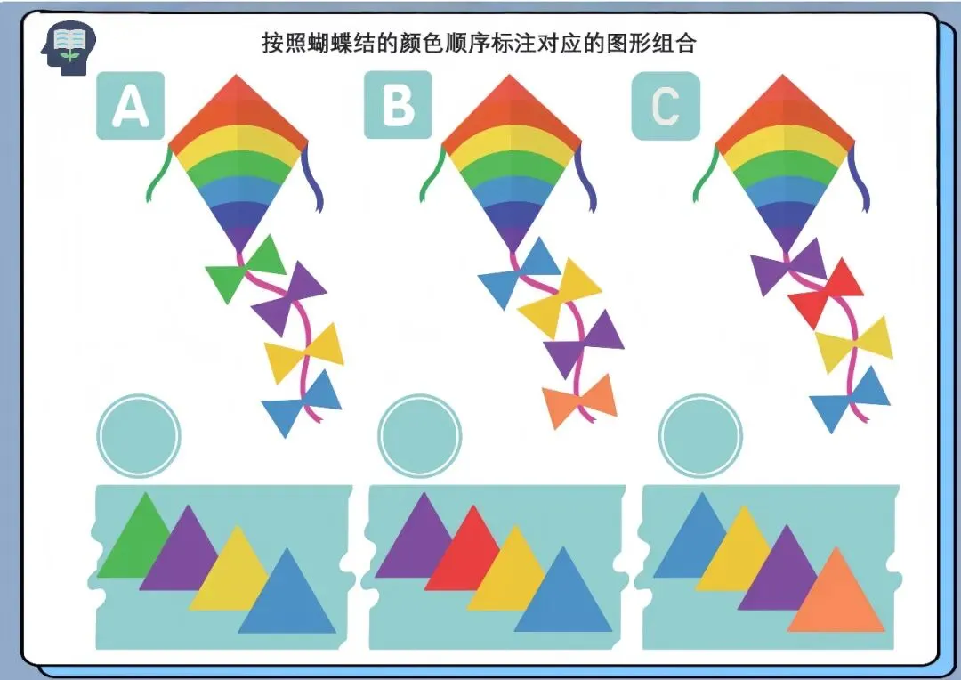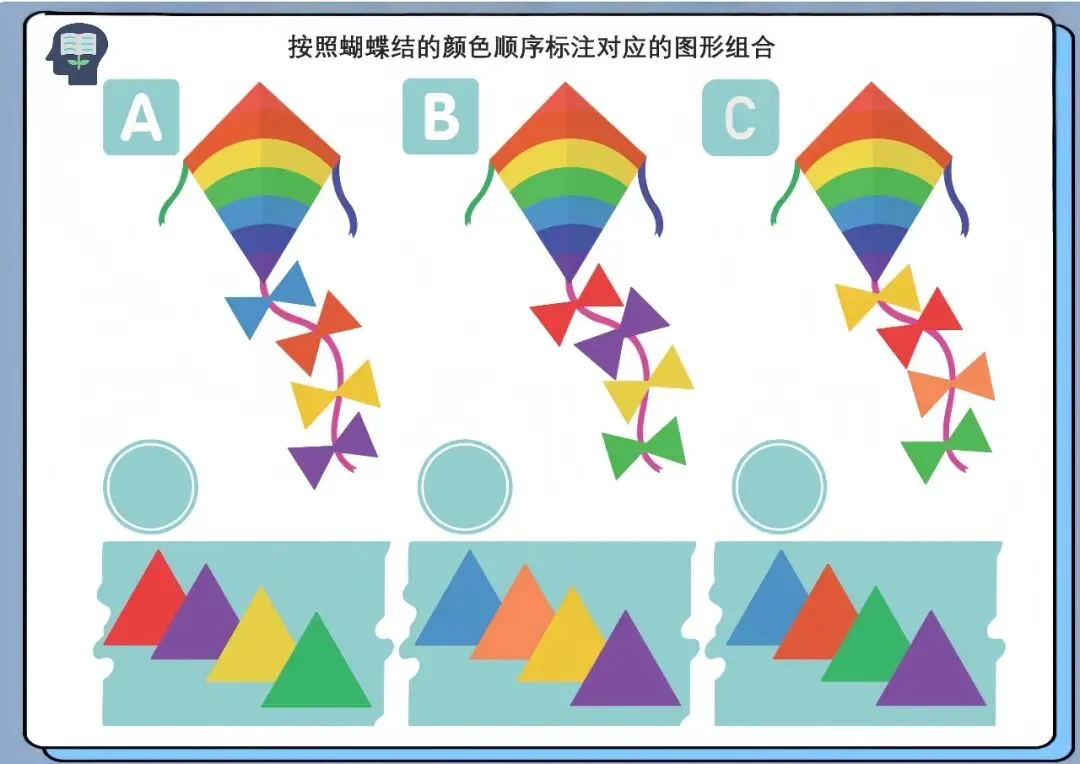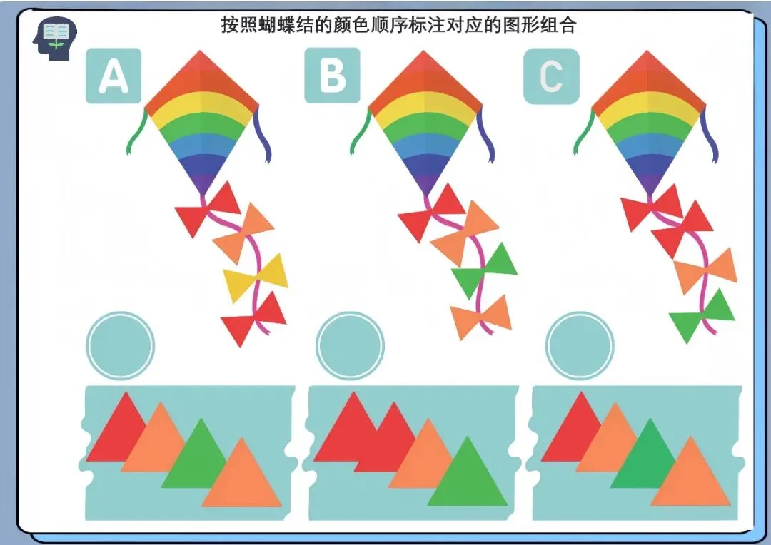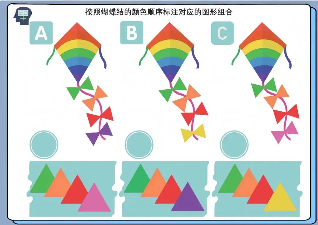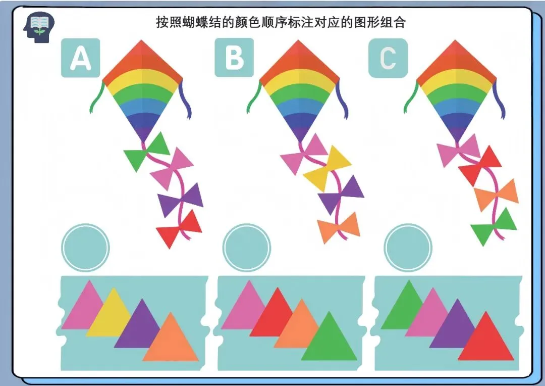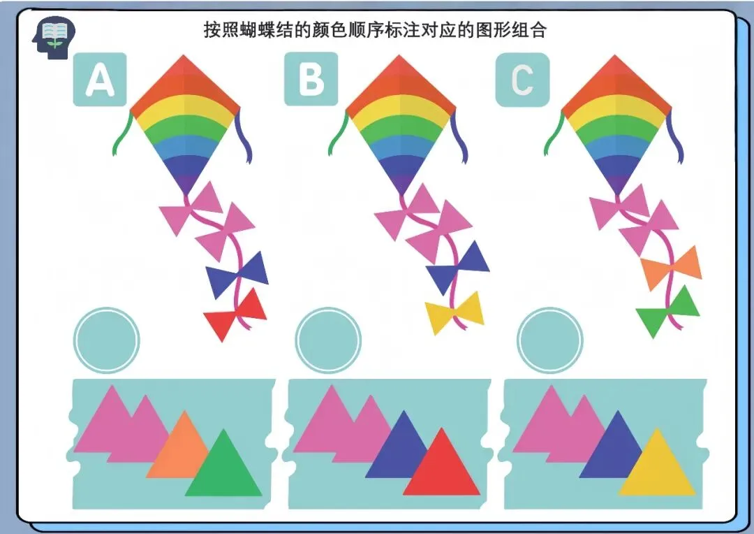 通过观察蝴蝶结的颜色顺序,将对应颜色的图形进行匹配与排序,完成组合任务。
