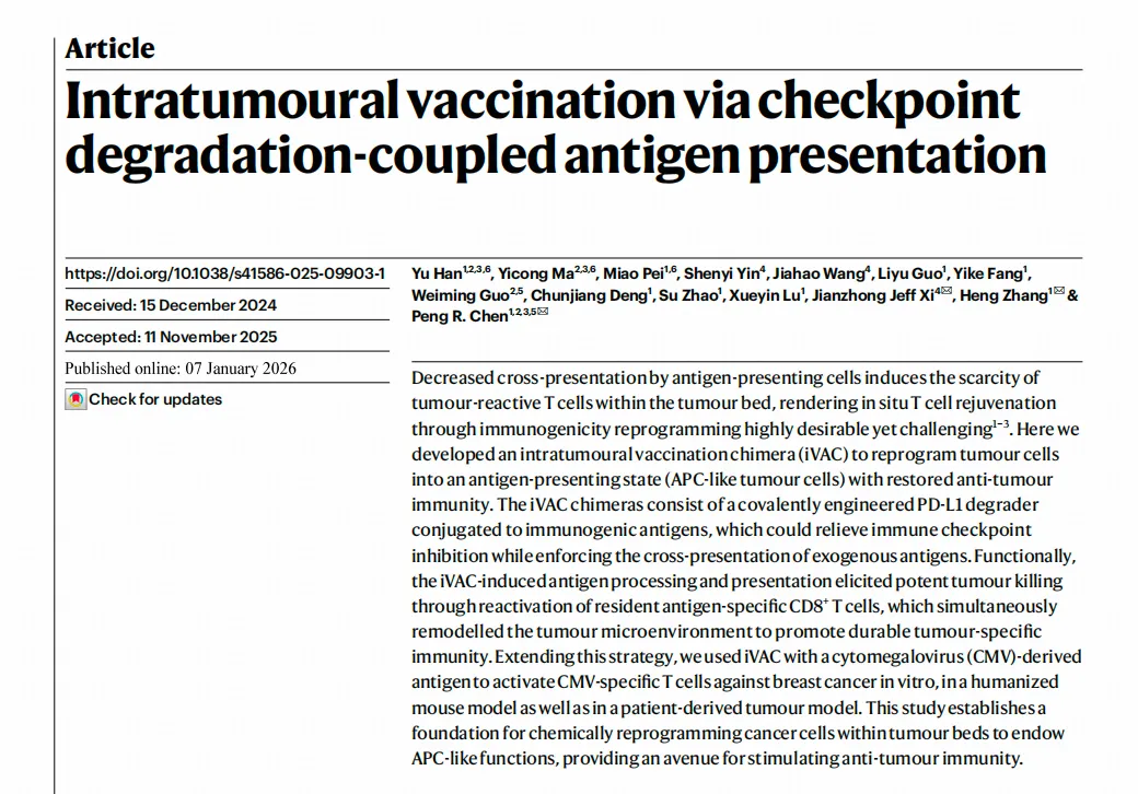 近日,北大研究团队发表在 Nature 上的一项突破性研究 “Intratumoural vaccination via checkpoint degradation-coupled antigen presentation”,提出了一种名为 iVAC 的创新策略。这项技术通过化学手段“重编程”癌细胞,将其转化为抗原呈递细胞,实现了免疫检查点降解(👈一键点击,获取深度解读)与抗原呈递的双重打击。