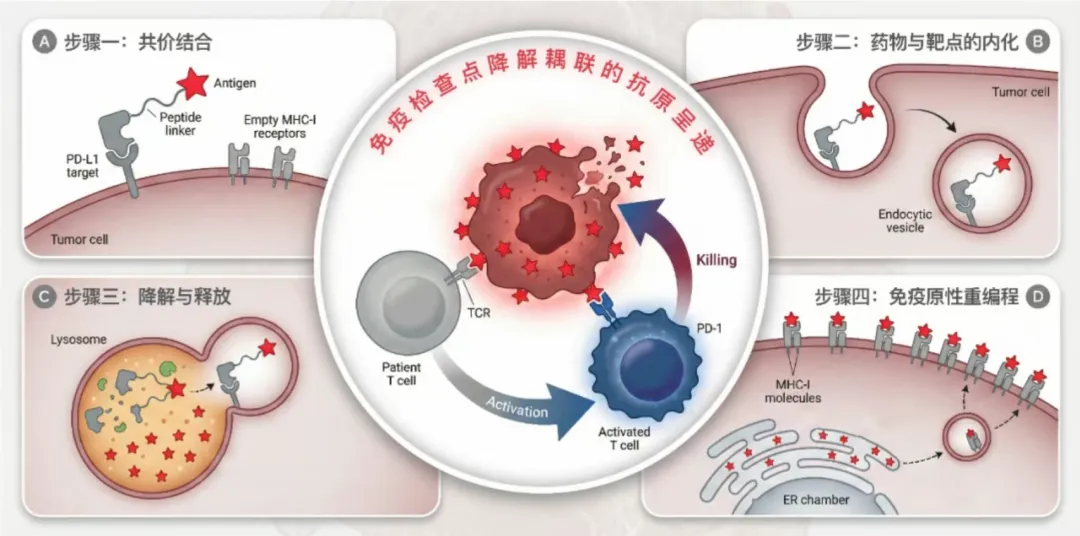 本研究开发了一种非基因层面的化学重编程策略(iVAC),创新性地将免疫检查点降解与外源抗原呈递偶联。它成功将癌细胞转化为“类抗原呈递细胞”,在解除免疫抑制的同时,利用机体既有的病毒免疫记忆,对肿瘤实施精确打击,并实现了持久的抗肿瘤免疫记忆。
