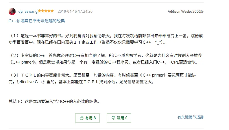 澳大利亚莫纳什大学的Alan Dorin教授直言,这是自己“最常翻阅的书”,相比之下其他C++文本都“有所欠缺”,而本书是编程收藏中“不可或缺的一部分”。