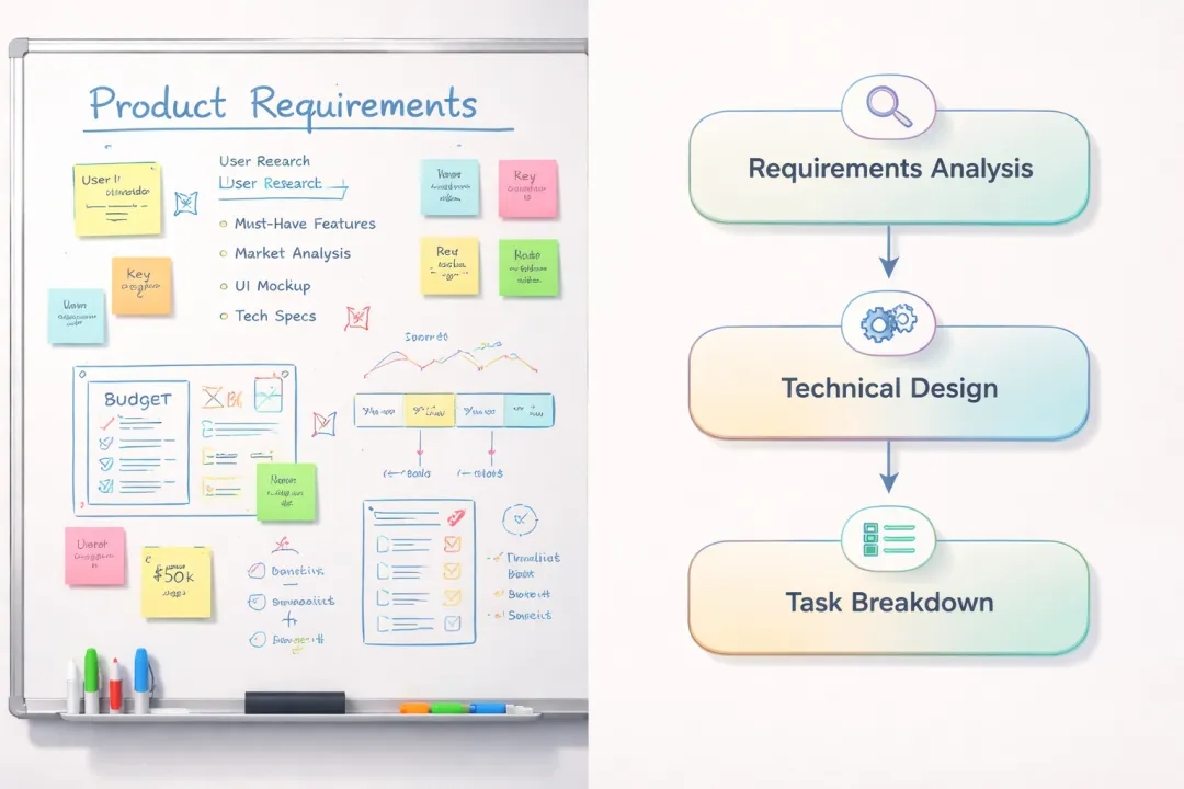 技术设计文档由架构师担任,涵盖技术选型、接口设计、数据模型设计和错误处理策略等,价值在于降低技术门槛,使初学者也能通过AI解析并理解专业设计内容。任务清单由项目经理担任,负责分阶段拆解任务,典型流程通常涵盖基础架构、数据模型、状态管理以及 UI 组件的迭代交付。