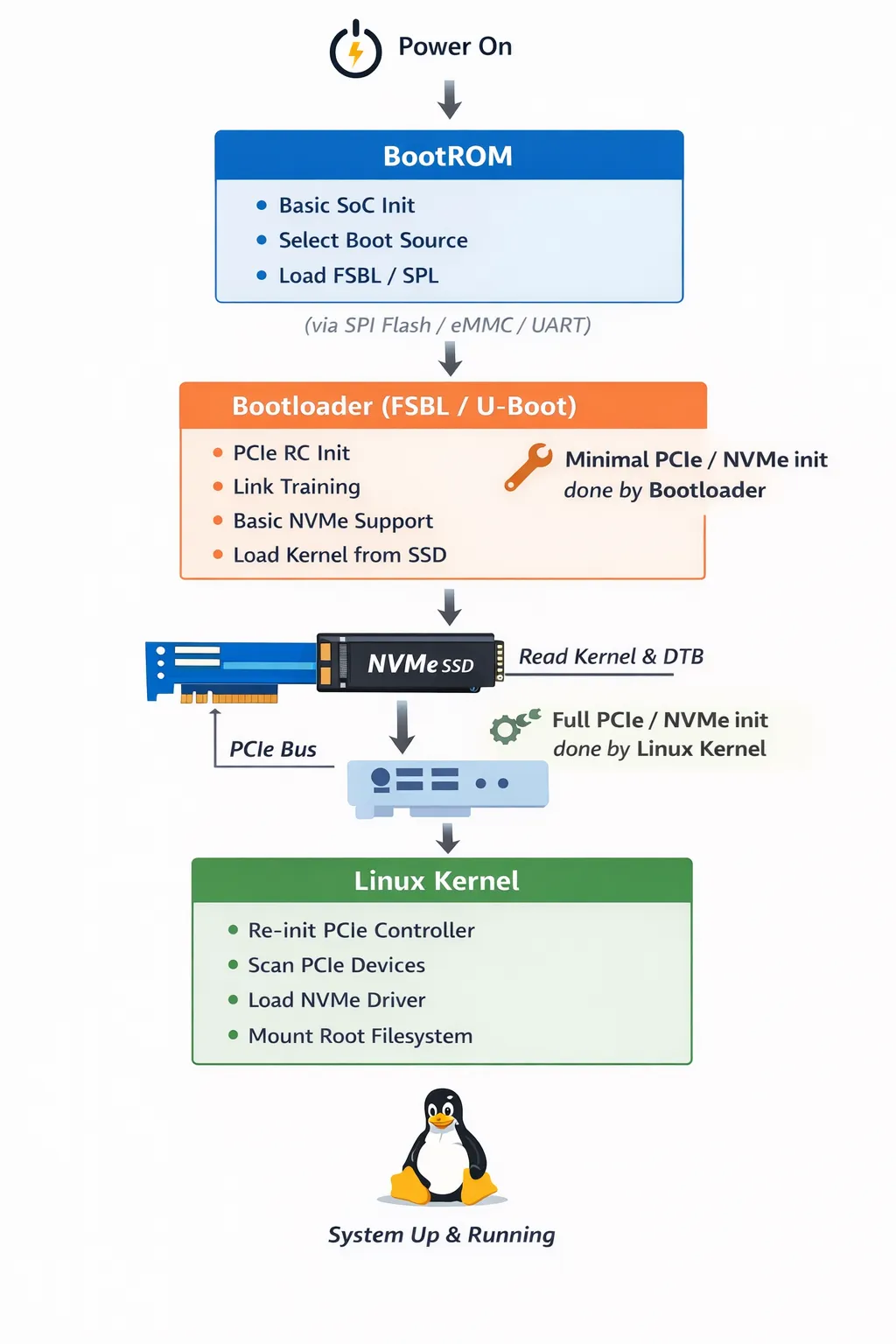 在 Linux 启动之前,系统仍运行在 Bootloader 阶段,此时 Bootloader 已完成最小化的 PCIe RC 初始化,并实现了仅用于启动的 NVMe 访问逻辑,其目标只是将内核镜像从 SSD 读入内存。