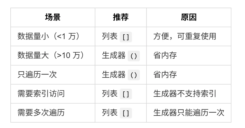 ```python# ✅ 正确写法:内存友好data = (x * 2for x inrange(100000000)) # 生成器```