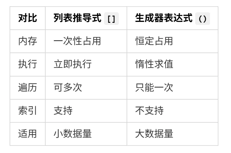```python# 列表:立即生成全部[x for x inrange(1000000)] # 内存中有100万个元素# 生成器:按需生成(x for x inrange(1000000)) # 内存中只有1个元素```
