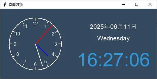 init_analog_clock():初始化模拟时钟,包括绘制表盘和刻度。update_analog_clock():每秒更新模拟时钟指针的位置。draw_hand():根据角度和长度绘制时钟指针。init_digital_clock():初始化数字时钟的标签(日期、星期、时间)。update_digital_clock():每秒更新数字时钟的时间显示。定时更新