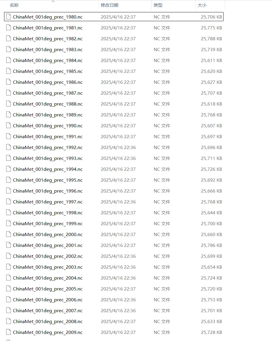 以下代码可快速读取 NC 文件,查看其维度、变量、元数据等关键信息,是转换前的必要准备,这里以中国降水nc数据做示例.数据来源为ChinaMet。