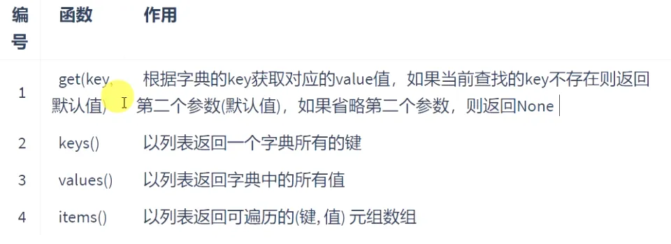# 1、定义一个字典cat = {'name':'Tom', 'age':5, 'address':'美国纽约'}# 2、获取字典的相关信息name = cat.get('name', 'ben') # 如果不存在这个key,value则显示默认值benage = cat.get('age')gender = cat.get('gender', 'male') # get(key, 默认值) 如果默认值为空,不存在key时,value则返回Noneaddress = cat.get('address')print(f'姓名:{name}, 年龄:{age}, 性别:{gender}, 地址:{address}')