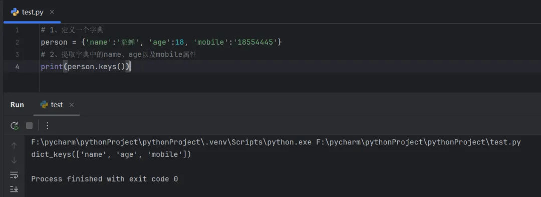# 1、定义一个字典person = {'name':'貂蝉', 'age':18, 'mobile':'18554445'}# 2、提取字典中的name、age以及mobile属性print(person.keys())