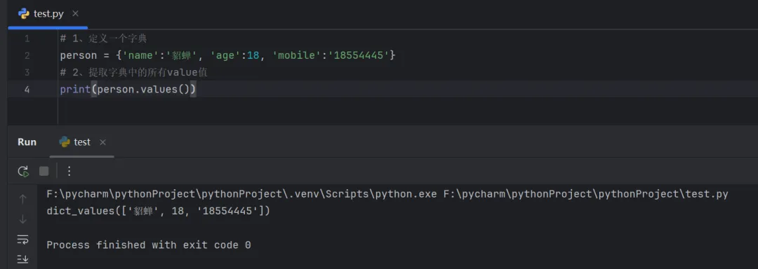 # 1、定义一个字典person = {'name':'貂蝉', 'age':18, 'mobile':'18554445'}# 2、提取字典中的所有value值print(person.values())