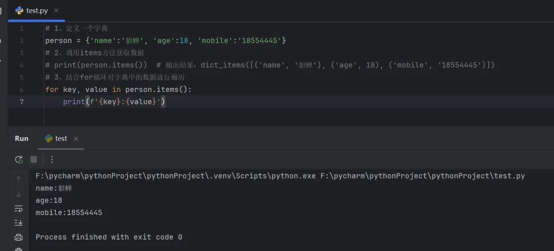 # 1、定义一个字典person = {'name':'貂蝉', 'age':18, 'mobile':'18554445'}# 2、调用items方法获取数据# print(person.items()) # 输出结果:dict_items([('name', '貂蝉'), ('age', 18), ('mobile', '18554445')])# 3、结合for循环对字典中的数据进行遍历for key, value in person.items(): print(f'{key}:{value}')