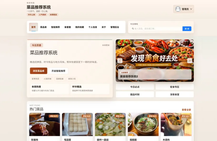 ●首页:展示轮播图、分类导航与热门/最新菜品,帮助用户快速进入内容。
