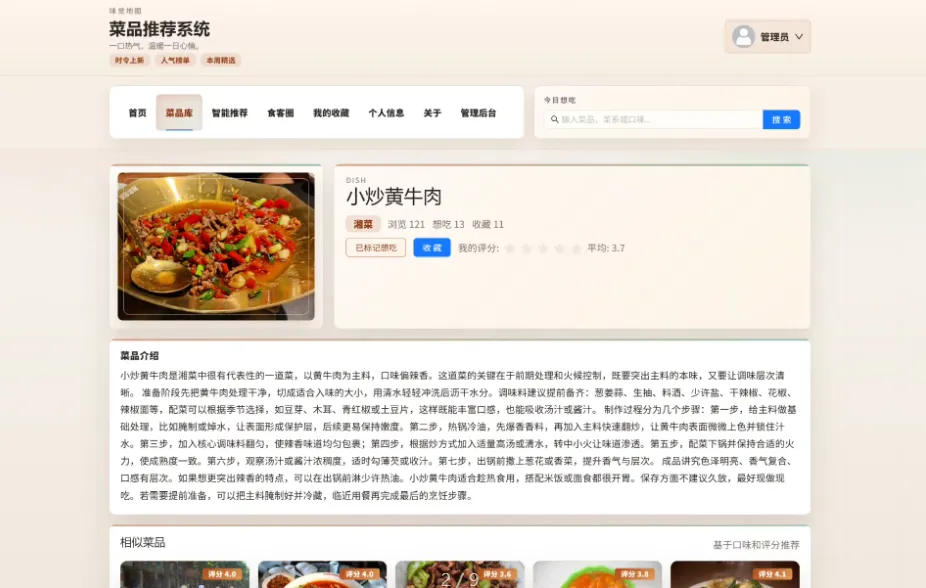 ●个性化推荐:基于用户行为的协同过滤推荐菜品,采用点击、点赞、评分多个权重纬度。