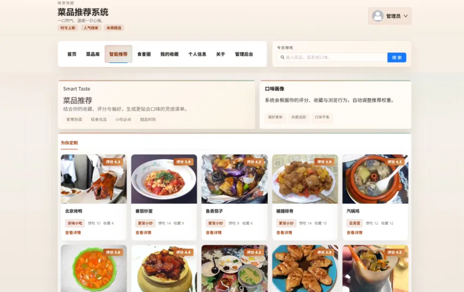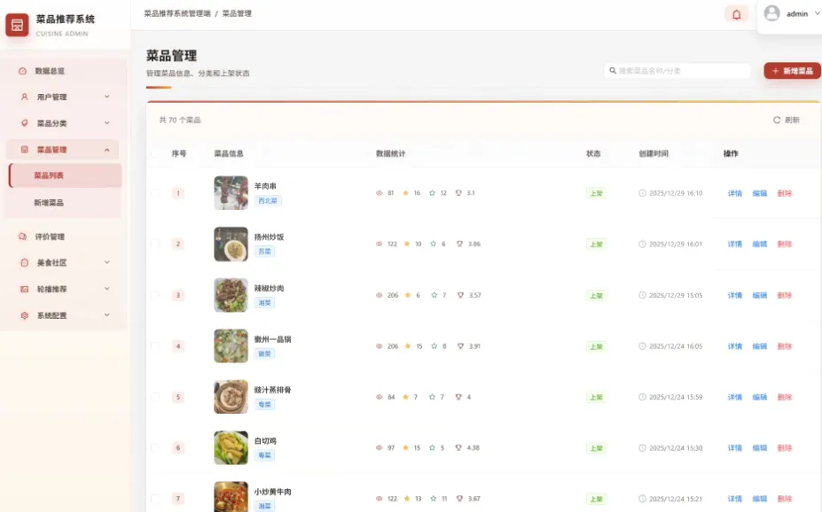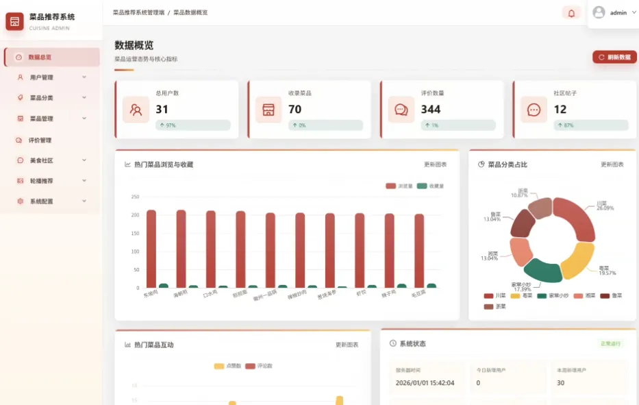 ●数据统计:展示用户、菜品、评论与活跃度等核心指标及趋势图表。