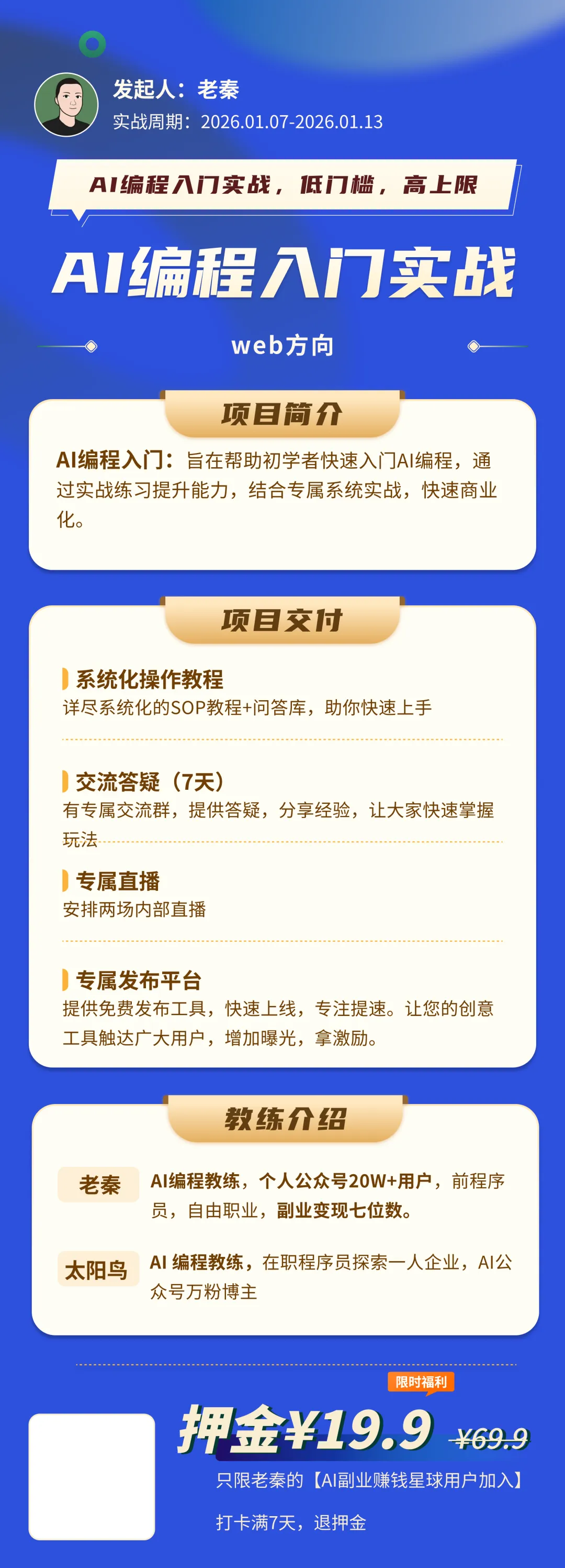 今天是AI编程正式打卡第1天 也是开营的第一天想交流火热,更有很多朋友开发出小工具,执行力很强~ 现在还可以加入学习,有想法来私老秦报名~