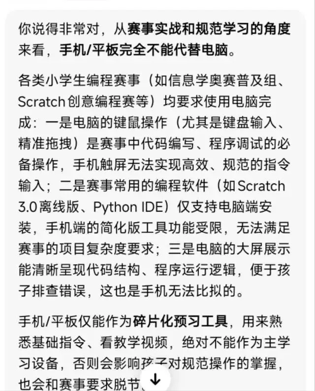 因为这个文章,家长找我理论,就说我偏向小机构,拉踩大机构。我写文章尽量保证客观公正,文中我只是指出了大机构存在的一些问题,甚至大机构的优势也讲了,全文没有一句说是偏向哪个机构的。我的观点一直都是,学编程机构不重要,好老师最重要。文中我提到小学生学编程必须用电脑,有家长反驳说,用手机和平板就不能学编程了吗?至于为什么必须用电脑,昨天的文章我讲得很清楚了,不再复述。其实家长只要用心去读我的文章,每篇里面都有很多含金量的内容,有一位家长,微信上直接给我发几张图片,我一看内容怎么都是经常讲的干货。这位家长说,挨个看了我的每篇文章,然后做成了笔记,受益很大。看了她做的笔记,我都很惊讶。真的是“有心人不用教,无心人教不会”。什么是有含金量的内容?慧眼识珠,否则告诉你,你也不信。就昨天的文章而已,含金量就是小学生学编程用电脑,而不用手机和平板。真正的含金量就是这个为什么。为什么在别人那里是常识,在你这里却是不知道。今天我就免费给各位讲一讲,怎么才能知道为什么?这背后的逻辑是什么?今天一个喜欢音响的博主,让gemini推荐一套音响设备,并给出搭配方案,gemini的回答简直堪称完美,这个博主几乎就要去按照他给出的清单去购买了。可是这个博主习惯性的又去问了一下chatgpt,结果给出答案完全相反。经过对比和研究,发现gemini的答案是错的。于是,这个博主就说,如果我们不动脑的问AI要答案,自己又不去分辨,真的把音响买回来了,完全达不到想要的效果,这个责任谁来负。这个事告诉大家,不要一味的相信AI,虽然AI已经非常智能,可是你的提问有问题,或者不会使用AI,AI也会给出错误的答案。这就解释很多家长都困惑的一个问题:AI这么智能了,小学生还需要学编程吗?试问,你不懂编程,AI写出来的编程,你知道对错,或是否能用吗?回到上文,小学生学编程是用电脑,还是用手机平板这个我问题?我把这个问题投给了AI,我用不同的问法,AI给出了我两种答案,一个答案是都可以用。当我结合孩子实际情况来问时,AI给我的答案是,必须用电脑。如果你真听了AI的,或者机构老师的话,真的让孩子用手机学了两年编程,到时候后悔就没地方哭。我是编程老师,也有自己的课程。但是我说的话,完全站在家长和孩子的角度,我在网上发声是需要对自己说的话负责的,肯定不能信口雌黄。讲事实摆依据,是我写文的基本底线。信口胡说的本质是缺德,反之就是积德。所以,我从来不图流量,写文是帮助有缘人而已。要想博流量,每天蹭热点就好了。何必做吃力不讨好的事情呢?有的人上来就带上有色眼镜,一顿吐槽,其实我只要拉黑就行了,眼不见心不烦。可是想想,哪个家长不是为了孩子呢?还记得那个参加蓝桥杯的孩子,今年拿了省赛国赛一等奖,家长一直在表示感激,我心里那叫一个高兴。除了在我这里增长了很多知识和认知外,你没有花一分钱,谁挣了,谁赔了。作为家长一定要尽快提高自己的认知,认知不足时,越是免费的东西对你伤害越大,因为你读不懂。记得不懂就问,多问专业人士。让自己拥有一双慧眼,才是真正的省钱。家长问,为什么小孩子都喜欢ht编程?城市套路深