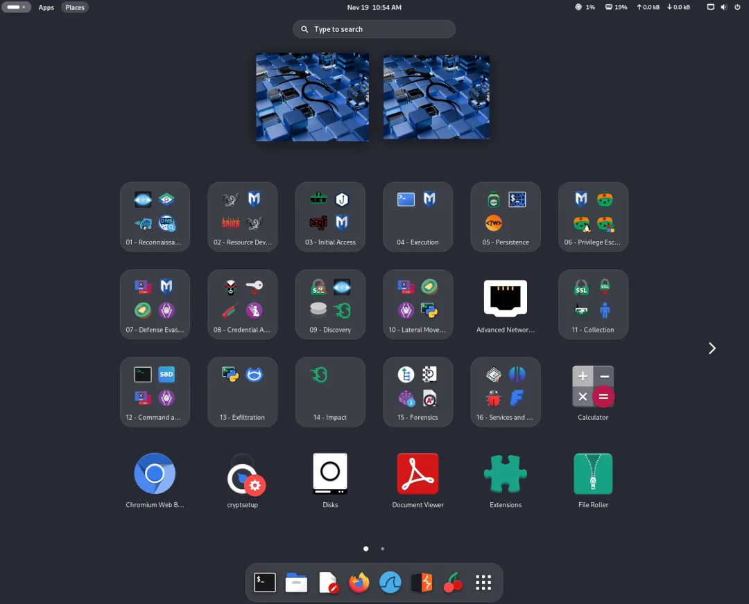 GNOME 49 是本次最亮眼的变化之一。Kali 团队为 GNOME 49 重新优化了主题,整体界面更清爽、视觉更流畅。应用网格(Application Grid)现在完全镜像了菜单结构,所有 Kali 工具被整齐分组到对应文件夹中——比如密码破解、无线审计、信息收集等分类一目了然,这对我们快速启动工具链非常友好。