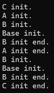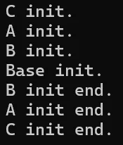 class Base: def __init__(s): print('Base init.')class A(Base): def __init__(s): print('A init.') super().__init__() print('A init end.')class B(Base): def __init__(s): print('B init.') super().__init__() print('B init end.')class C(A, B): def __init__(s): print('C init.') super().__init__() print('C init end.')C()
