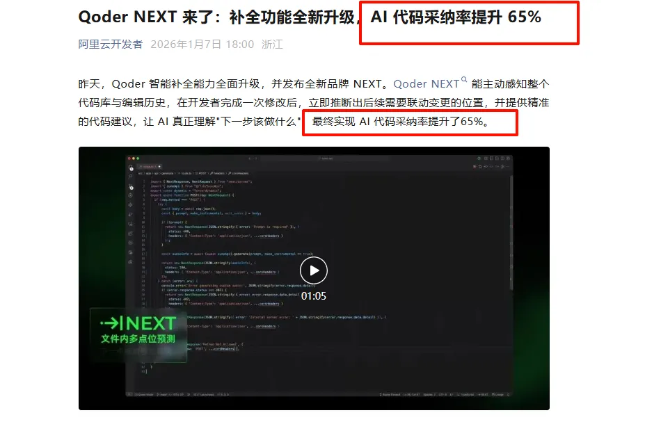 然后我们就可以看到,AI IDE,都在卷这个采纳率。Qoder Next最新采纳率提升了65%!