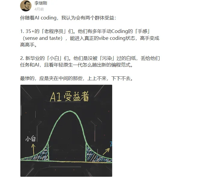 李继刚有个很有意思的观点,AI Coding 受益最大的是 35+的老程序员,他们有Sense有Taste,知道道哪里该改,哪里是坑。