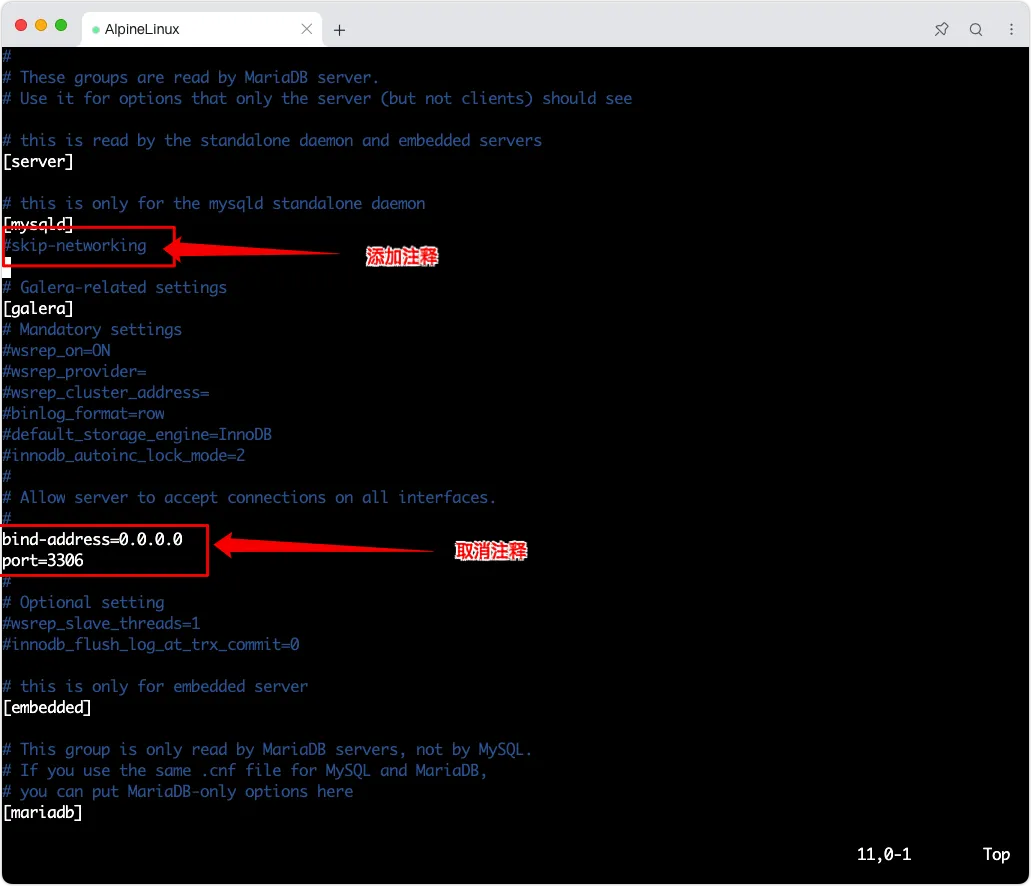 编辑MariaDB配置文件以允许远程连接: