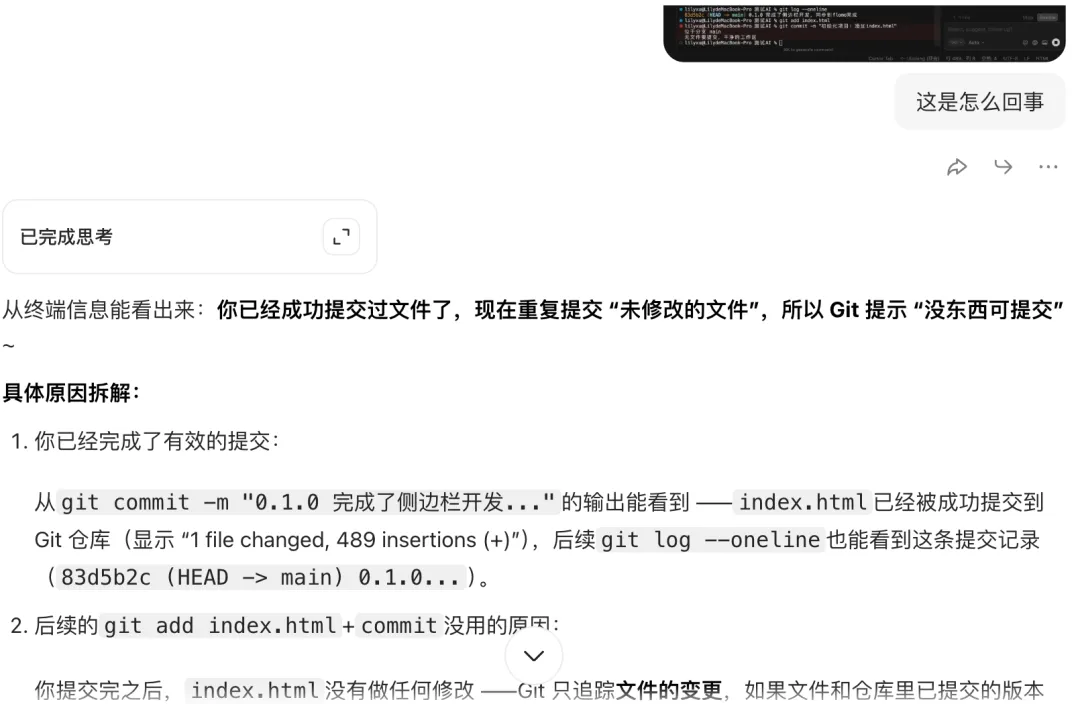 由于我实在没有任何程序员背景,在把代码推送给github的过程中,我遇到了很多问题,不知道指令应该怎么给,而这个过程当中,我都是有问题随时问豆包。