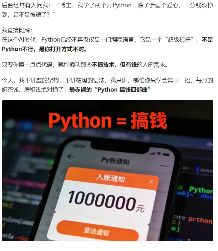 兄弟们,在这个“副业刚需”的时代,如果你手握Python这把屠龙刀,却只会用它来