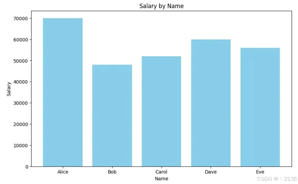 import matplotlib.pyplot as plt# 绘制柱状图plt.figure(figsize=(10, 6))plt.bar(data['Name'], data['Salary'], color='skyblue')plt.title('Salary by Name')plt.xlabel('Name')plt.ylabel('Salary')plt.show()输出:
