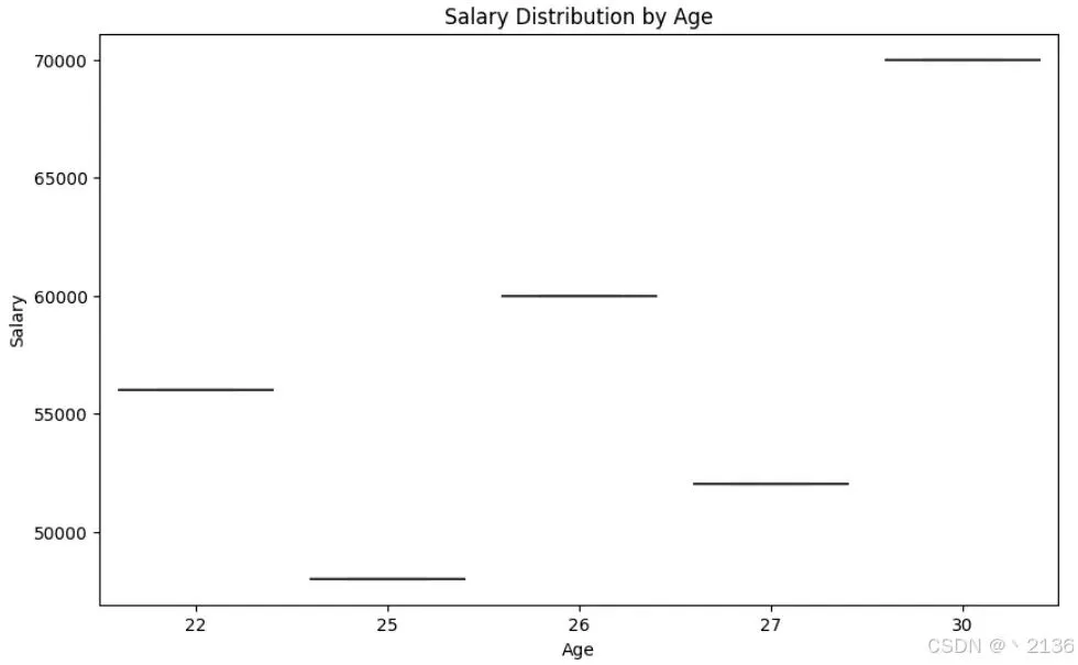 Name Age SalaryDate 2020-01-31 Alice 30 70000.02020-02-29 Bob 25 48000.02020-03-31 Carol 27 52000.02020-04-30 Dave 26 60000.02020-05-31 Eve 22 56000.0数据可视化能够直观展示数据分析的结果。