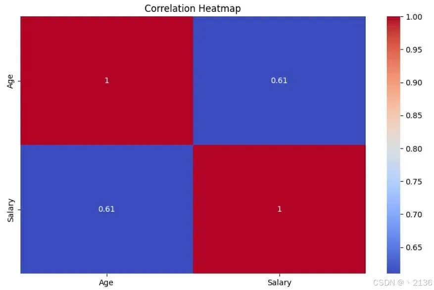 # 计算相关性矩阵,只包括数值列correlation_matrix = data[['Age', 'Salary']].corr()print(correlation_matrix)输出:
