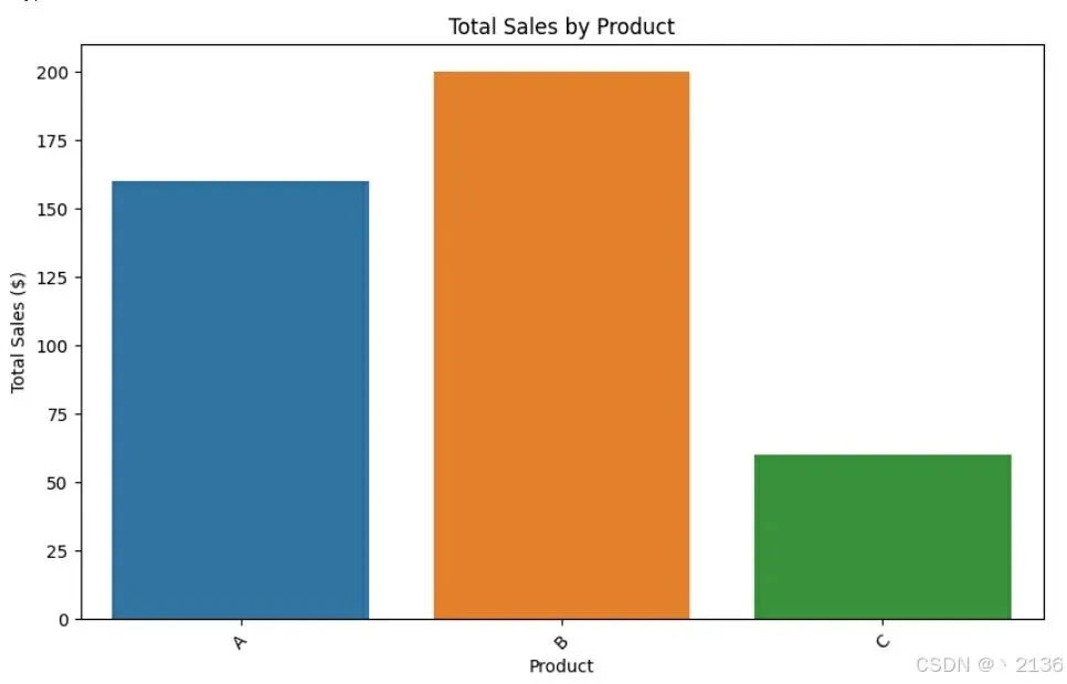 import pandas as pdimport numpy as npimport matplotlib.pyplot as pltimport seaborn as sns# 1. 生成示例销售数据data = {'OrderID': range(1, 11),'Product': ['A', 'B', 'C', 'A', 'B', 'C', 'A', 'B', 'C', 'A'],'Quantity': [5, 2, 0, 3, 1, 4, 6, 7, 0, 2],'Price': [10.0, 20.0, 15.0, 10.0, 20.0, 15.0, 10.0, 20.0, 15.0, 10.0],'Date': pd.date_range(start='2023-01-01', periods=10, freq='D')}sales_data = pd.DataFrame(data)# 2. 数据预处理# 检查缺失值print(sales_data.isnull().sum())# 填充缺失值(若有)sales_data['Quantity'].fillna(0, inplace=True)sales_data['Price'].fillna(sales_data['Price'].median(), inplace=True)# 3. 计算总销售额sales_data['TotalSales'] = sales_data['Quantity'] * sales_data['Price']# 4. 按产品分组计算总销售额product_sales = sales_data.groupby('Product')['TotalSales'].sum().reset_index()# 5. 数据可视化plt.figure(figsize=(10, 6))sns.barplot(x='Product', y='TotalSales', data=product_sales)plt.title('Total Sales by Product')plt.xlabel('Product')plt.ylabel('Total Sales ($)')plt.xticks(rotation=45)plt.show()说明: