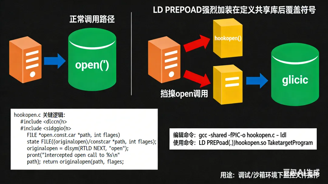 LD_PRELOAD)memfd_create)/proc/self/fdptrace所有技巧均基于标准 Linux 系统(glibc + kernel ≥ 4.0),附带可运行代码示例与生产级注意事项。