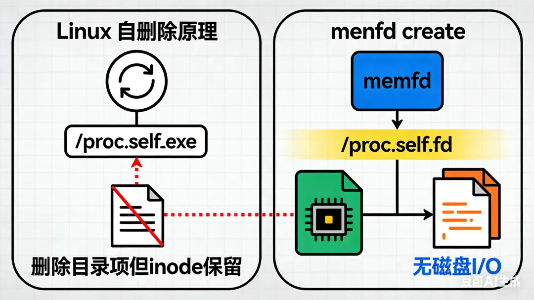 /tmp 可被监控,memfd 仅通过 FD 访问)结合 memfd_create + execve,实现完全不写磁盘的程序执行: