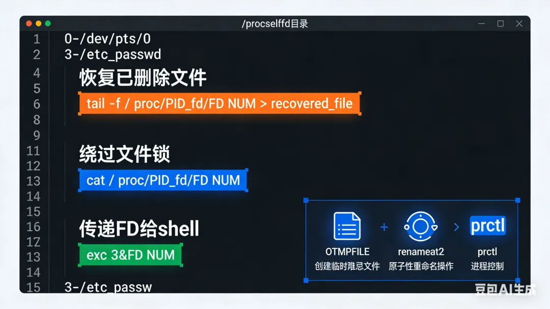 /proc/self/fd:文件描述符的万能钥匙每个打开的 FD 在 /proc/self/fd/ 下有对应符号链接: