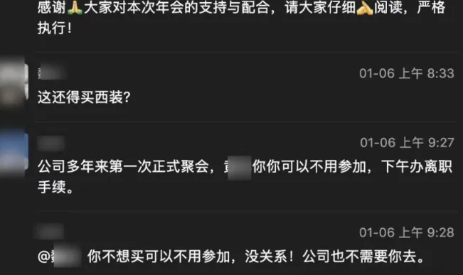 近日,国产某操作系统巨头因年会着装要求闹出大瓜:公司临时通知1月9日年会必须穿正装西装,只给员工几天准备时间。一位负责Linux内核开发的核心工程师在群里问了一句“这还得买西装?”,结果被董事长当场“秒开除”。不止他一人,群里附和“+1”的同事也被一并处理。