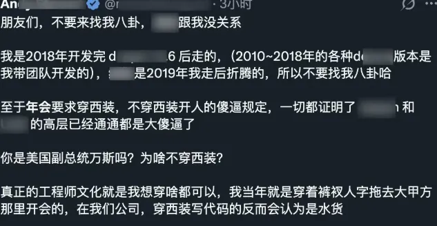 一个靠技术吃饭的OS公司,却把“穿西装”当成头等大事,放着珍贵的Linux内核人才不珍惜,反倒为形式主义大开杀戒。真正的工程师文化,是裤衩人字拖也能写出牛逼代码;穿西装写代码的,反而容易被质疑是“水货”。