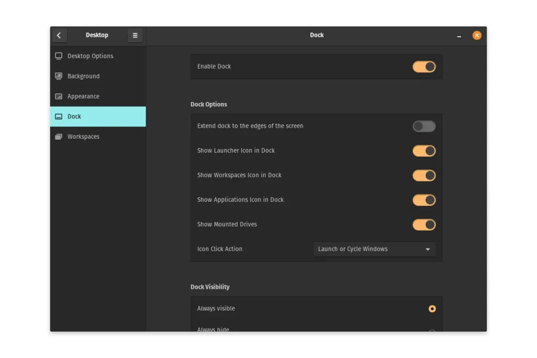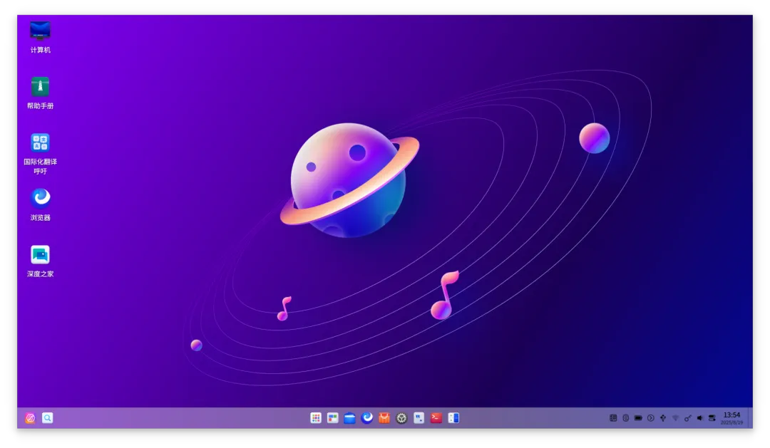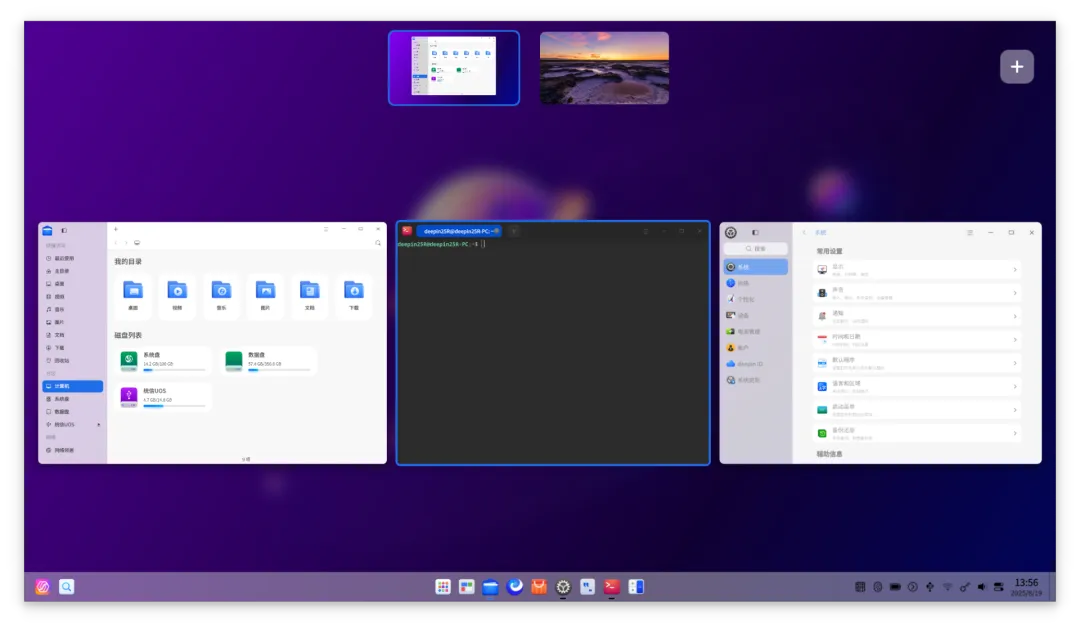 Deepin 的 DDE 桌面环境的亮点是 漂亮的动画效果、精致的图标和现代感十足的控制中心。任务栏可以在 macOS 的 Dock 模式和 Windows 的任务栏模式之间切换。整体视觉效果非常统一,自带的应用商店和原生应用也都经过了精心设计。