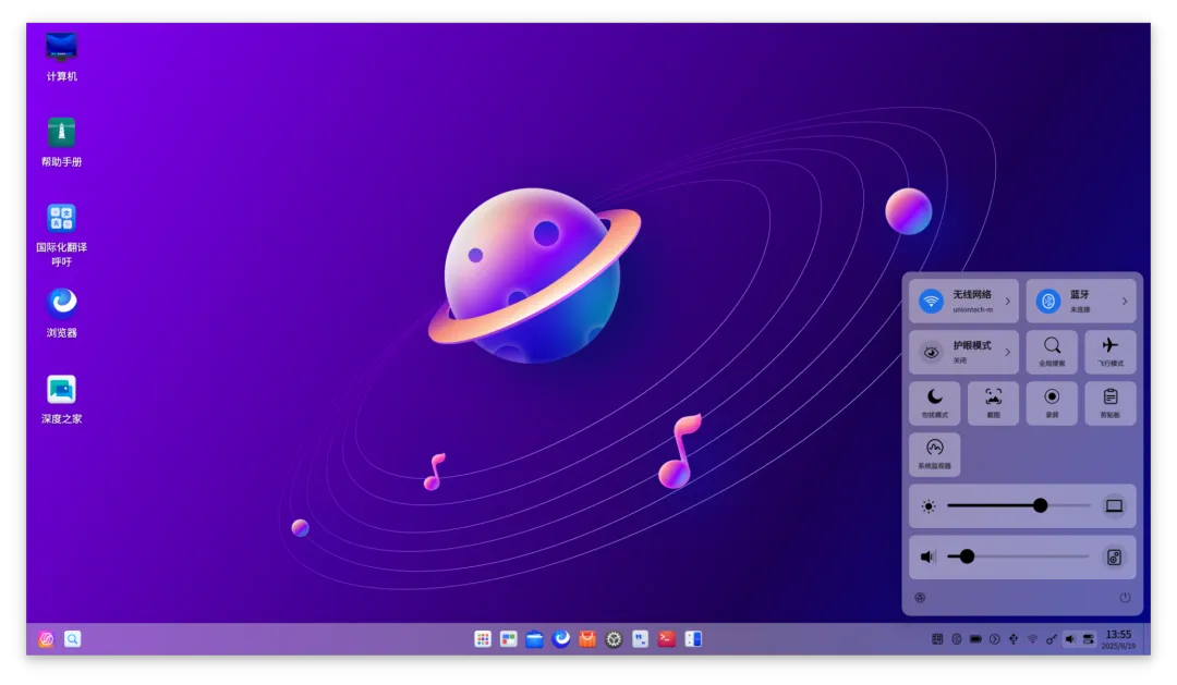 非常漂亮的 DDE (Deepin Desktop Environment) 桌面环境,是国产 Linux 的骄傲。主要由桌面、启动器、任务栏、控制中心、窗口管理器等组成。
