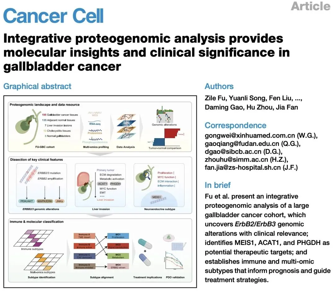 近日,复旦大学附属中山医院樊嘉院士教授团队联合国内多家科研机构,在国际顶级期刊《Cancer Cell》发表重磅研究成果。该团队通过对 195 例胆囊癌患者样本进行整合蛋白质基因组学分析,首次绘制出胆囊癌的分子特征全景图,发现多个潜在治疗靶点和分子分型体系,为这一恶性肿瘤的精准治疗开辟新路径。