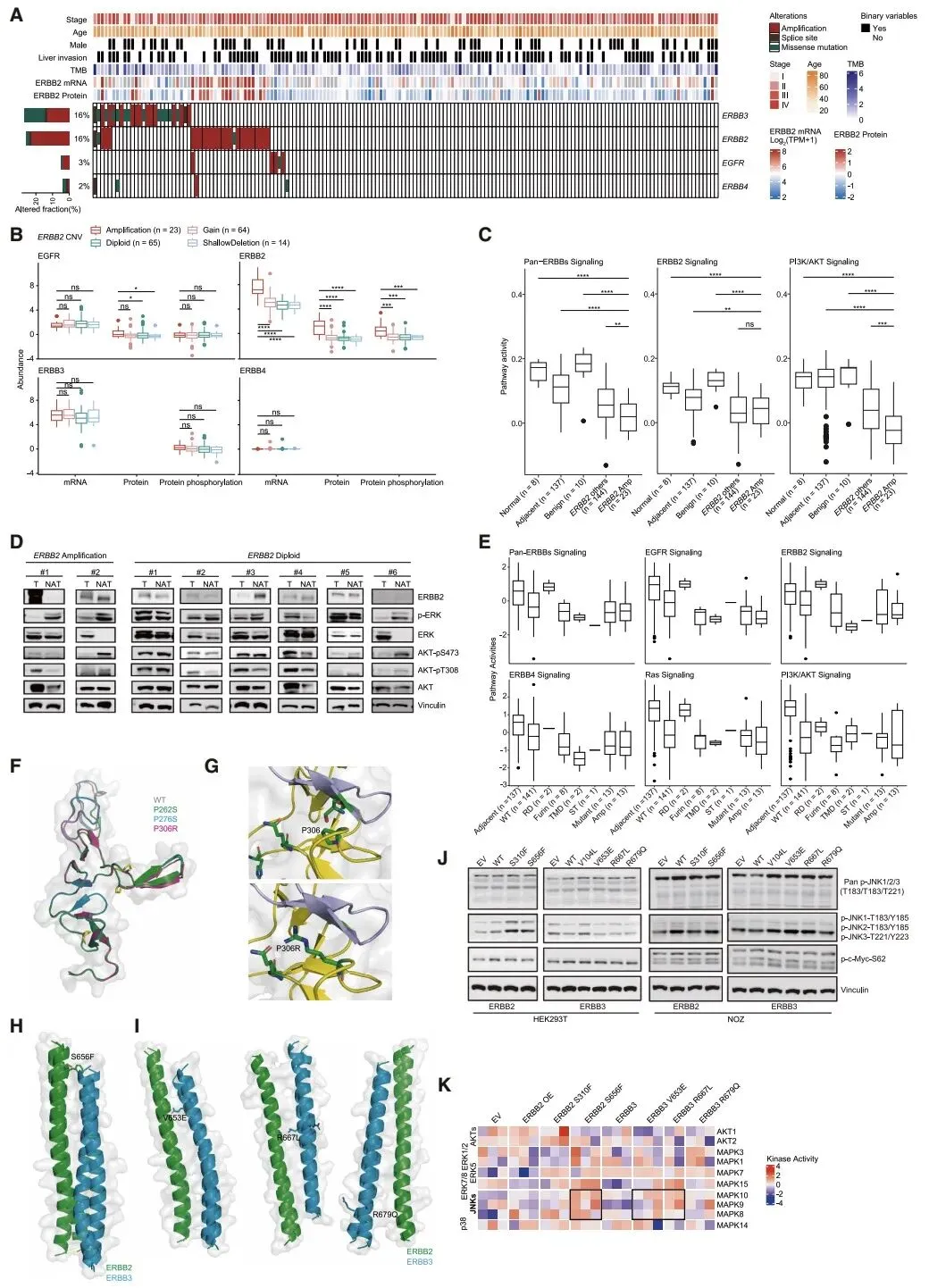 研究团队采用全外显子测序、RNA 测序、蛋白质组学和磷酸化蛋白质组学等多种技术,对 195 例胆囊癌组织和 135 例癌旁正常组织进行系统分析,鉴定出 47.9% 的患者存在 TP53 基因突变,9.0% 存在 ELF3 基因突变,这些突变通过扰乱信号传导和代谢过程驱动肿瘤发生。尤为重要的是,研究发现 ErbB2/ErbB3 基因改变在胆囊癌中发挥关键作用,ErbB2 扩增通过非经典信号通路促进肿瘤增殖,而 ErbB3 的 P306R 等突变则增强其与 ErbB2 的异源二聚体活性,为靶向治疗提供了新的作用位点。