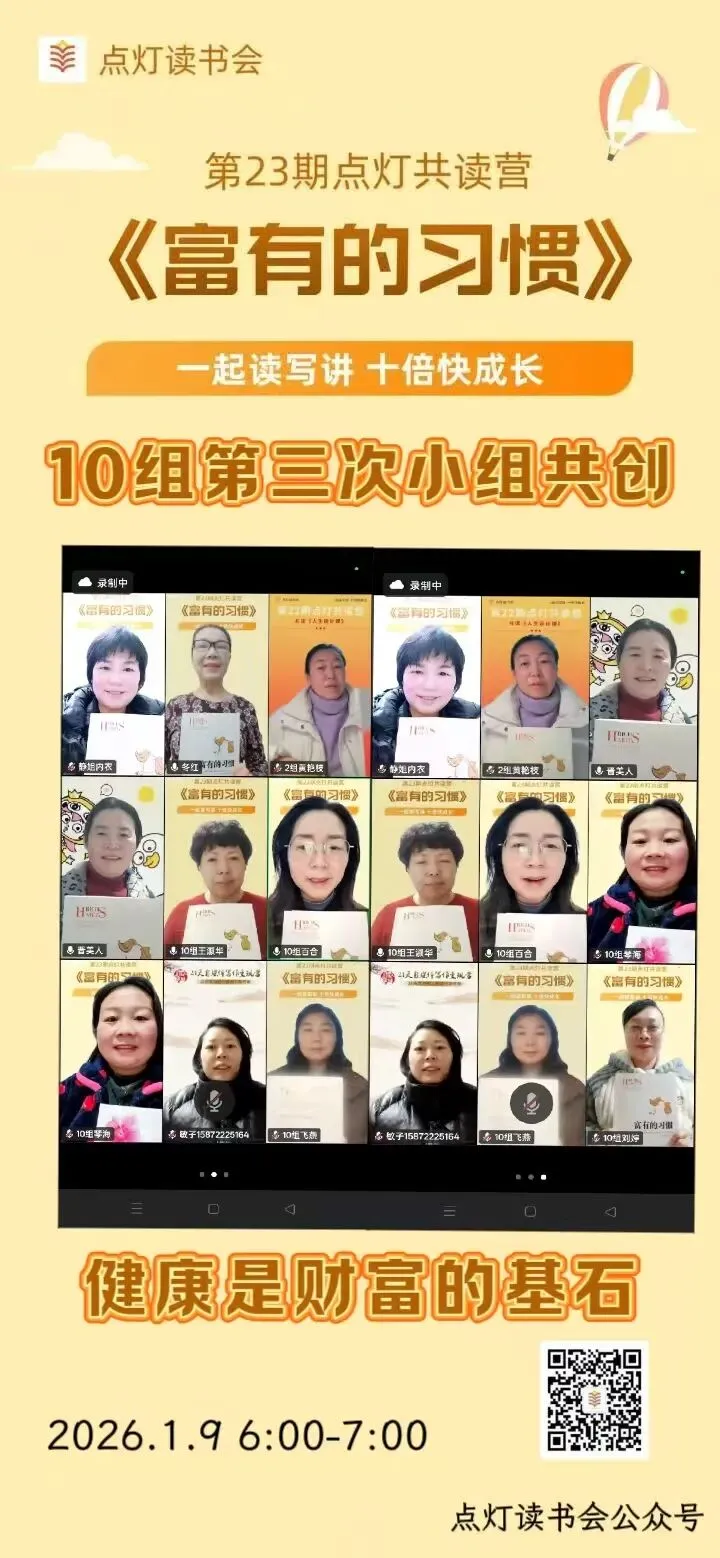 这是我们小组的第三次健康主题共创分享。晨光微熹的直播间里,十一位伙伴围坐在一起,以《富有的习惯》为底色,聊运动、谈饮食、话睡眠、悟心态,没有枯燥说教,只有滚烫的生活分享,聊着聊着便走进了心流时刻。