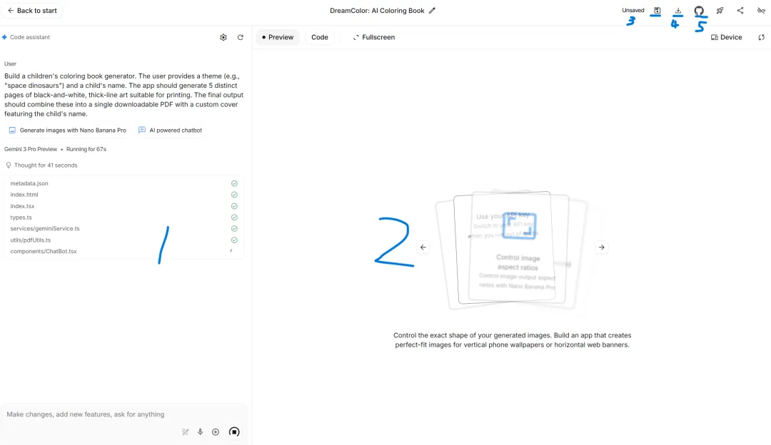 ⚠️可能由于谷歌内置了prompt的原因,[2] Build 不一定会遵循 [1] Playground 设计好的技术栈。