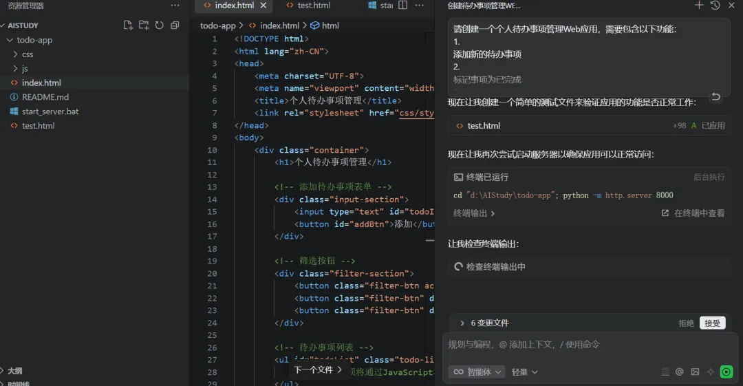 在Agent Mode下,Qoder会开始自动创建文件结构。你可以看到它: