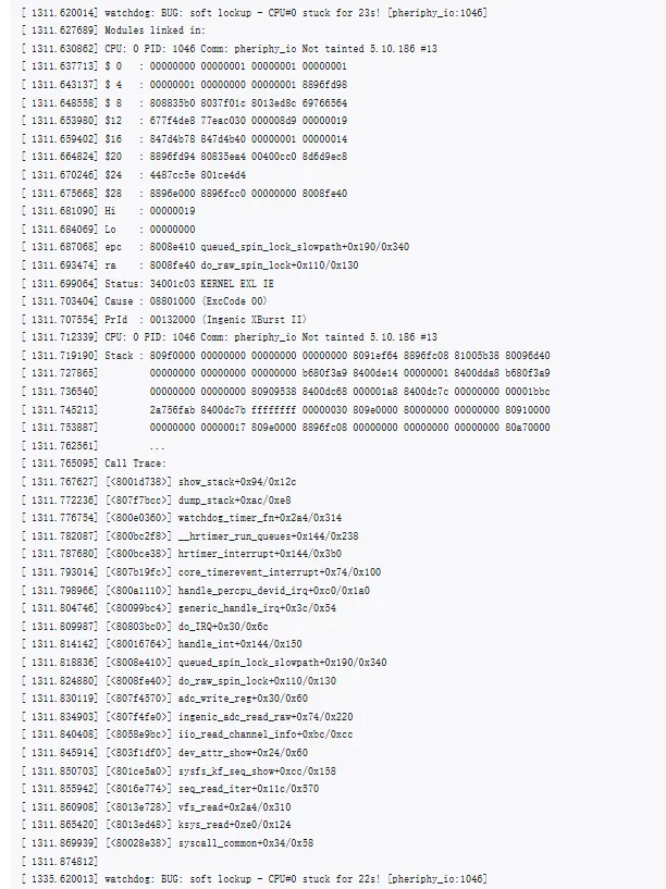 // 可能的修复方向staticirqreturn_tingenic_sadc_irq(int irq, void *dev_id){// 使用spin_lock_irqsave替代spin_lockunsigned long flags;spin_lock_irqsave(&adc_lock, flags);// 处理逻辑spin_unlock_irqrestore(&adc_lock, flags);return IRQ_HANDLED;}