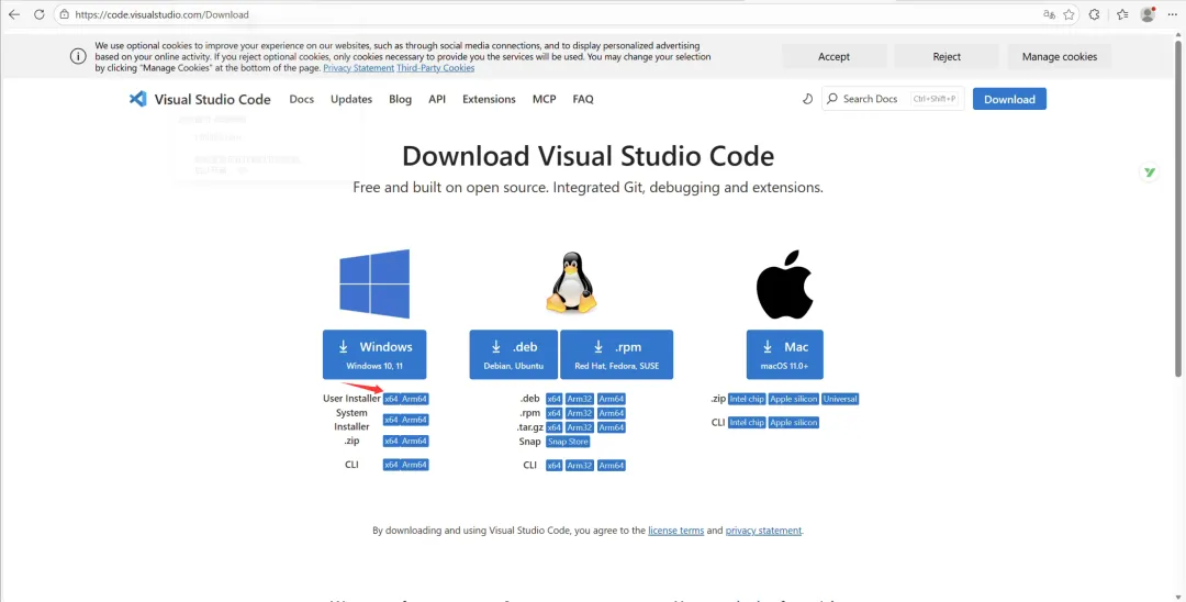 进入官网下载:(现在都是64位操作系统,请注意) 👉 https://code.visualstudio.com/Download