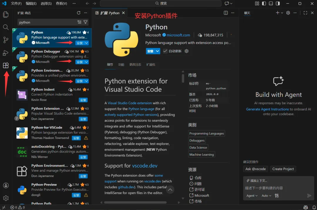 安装官方插件: Python(by Microsoft)